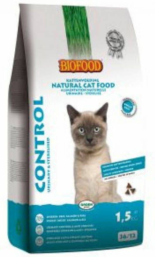 Biofood Kattenvoer Control Ondersteunt Urinewegen Biofood control is hoogwaardige volledige natuurlijke kattenvoeding die ontwikkeld is voor volwassen katten, ter ondersteuning van de urinewegen en bij overgewicht (bijv. * 70% aan kip, zalm, kippenlever en rijst * Met prebiotica FOS (inuline), zalmolie met omega 3 en 6 vetzuren en taurine * Hoge acceptatie en verteerbaarheid * Voor katten met struvietaandoeningen zoals blaasgruis en stenen * Ondersteunt de urinewegen.