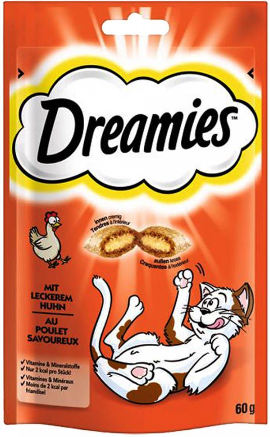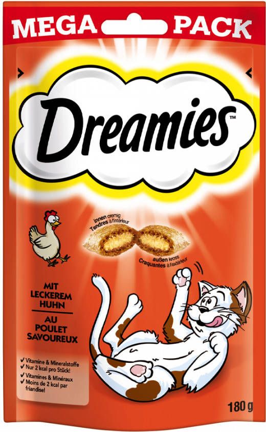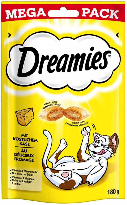 Wil je je kat met iets verwennen waarvan zij altijd al had gedroomd? Nu zijn er de Catisfactions kattensnacks, de heerlijke beloning voor tussendoor, aan de buitenkant krokant en binnenin crèmig. De crèmige vulling in het krokante jasje is precies het juiste voor alle katten. De handige, hersluitbare verpakking houdt de kattensnacks vers, zodat je jouw kat iedere dag opnieuw kunt verwennen. Nu in een big pack voor nog meer onvergetelijke knabbeldromen! Schud de zak en je kat komt aangerend! Dreamies zijn een droom voor elke kat.
