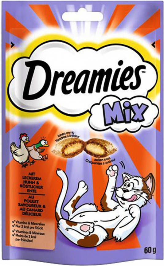 Dreamies Cat Snacks Mix Dreamies Cat Snacks Mix zijn overheerlijke kattensnoepjes. In een zakje zitten twee smaken gemixt. Hierdoor kunt u uw kat altijd blijven verassen. De snacks hebben een krokant buitenlaagje met een zachte vulling waardoor deze lekkernij extra smakelijk is voor uw kat. Smaken Zalm en kaas Kip en eend Kaas en rund Inhoud 60 gram Samenstelling Zalm en kaas Zalmsnacks: plantaardige eiwitextracten, granen, oliën en vetten, vlees en dierlijke bijproducten, mineralen, vis en -bijproducten (4% zalm). Kaassnacks: plantaardige eiwitextracten, granen, oliën en vetten, vlees en dierlijke bijproducten, mineralen, melk en zuivelproducten (4% kaas). Kip en eend Kipsnacks: plantaardige eiwitextracten, granen, vlees en dierlijke bijproducten (4% kip), oliën en vetten, mineralen. Eendsnacks: plantaardige eiwitextracten, granen, vlees en dierlijke bijproducten (% eend), oliën en vetten, mineralen.