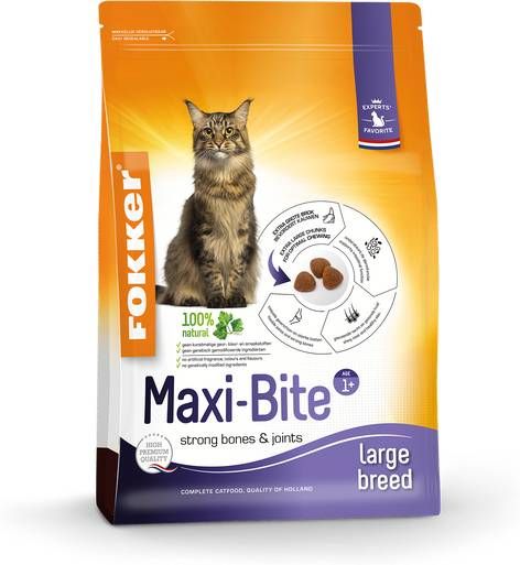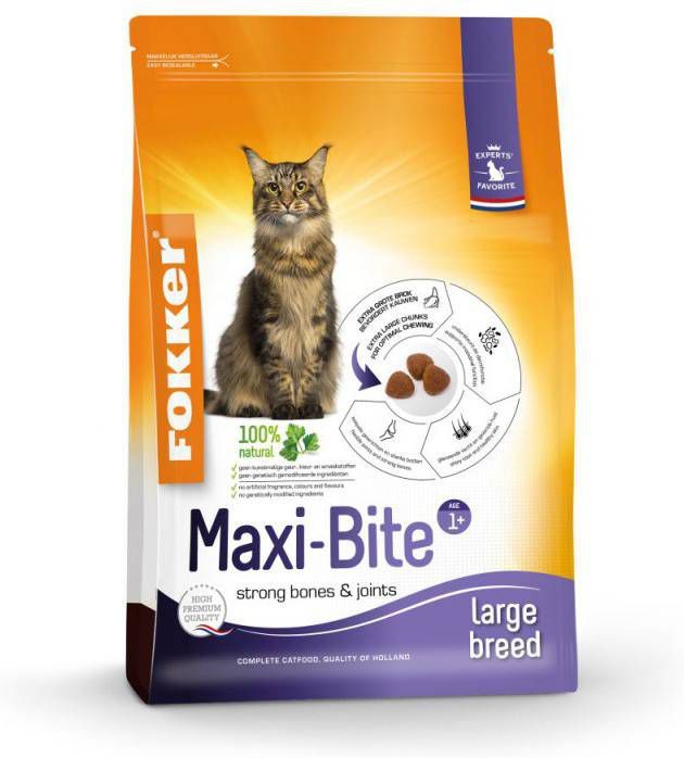 Fokker Maxi-Bite Kattenvoer speciaal voor large breed kattenMaxi-Bite kattenbrokken van Fokker zijn speciaal ontwikkeld voor de grotere katten rassen. Door de grotere brokken en de aangepaste ingredinten zijn deze brokken perfect voor grote katten. De grotere brokken zorgen ervoor dat de kat bewust en goed kan kauwen. Daarnaast draagt het voer bij aan soepele gewrichten en sterke botten. * Groter brokformaat * Zorgt voor glanzende vacht en gezonde huid * Tarwe(gluten) vrij * Ondersteunt de darmfunctie.