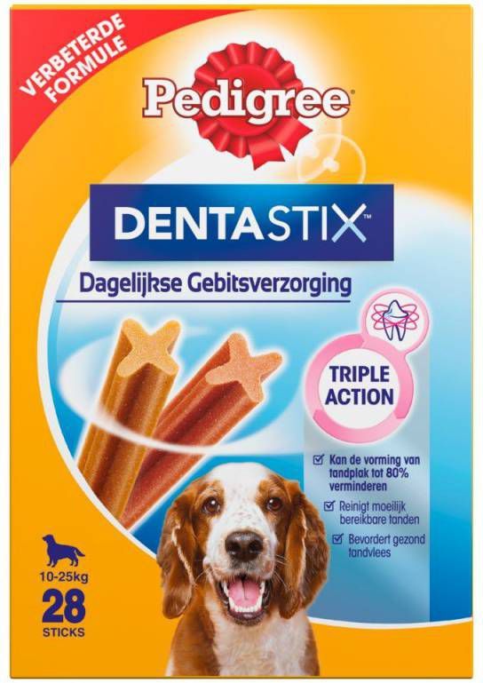 Pedigree Dentastix Medium hondensnack 10-25 kg zijn goed voor het gebit. Door de unieke vorm reinigen de stix de tanden tijdens het kauwen en helpen zo tandsteen te voorkomen.
