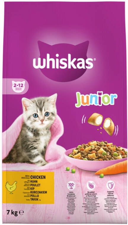 Whiskas Droog Junior Kip 7 kgWhiskas 2 -12 maanden droge brokjes is volledige en gebalanceerde voeding met een optimale balans van vitaminen en mineralen, om te helpen de best mogelijke verzorging te geven aan jouw jonge kat. * Volledige en gebalanceerde voeding * Voor jonge katten vanaf 2 12 maanden.