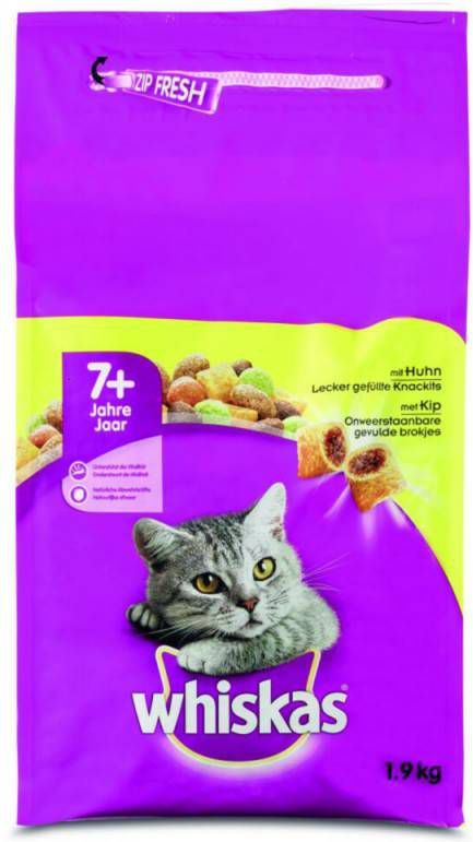 Uniek aan Whiskas is de structuur van de brokjes. Deze zijn namelijk hard van buiten en heerlijk mals van binnen. De licht schurende brokjes zorgen er ook nog eens voor dat het gebit gezond blijft. Zo is elk brokje een feestje en zullen zelfs de meest kieskeurige seniorkatten van deze voeding genieten.