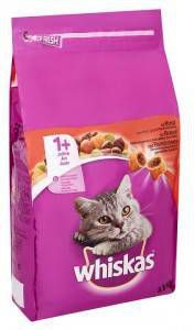 Whiskas 1+ Adult Droge Brokjes Rund is verkrijgbaar in 900 g, 1,9 kg en 3,8 kg.