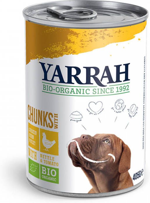 Yarrah Biologisch Hondenvoer Chunks KipYarrah Biologisch Hondenvoer Chunks Kip zijn smakelijke chunks met biologische kip, aangevuld met biologisch gecertificeerde brandnetel en tomaat. Geschikt voor alle honden, van puppy’s tot senior honden. Het biologische natvoer vormt een complete, voedzame en zeer smakelijke maaltijd voor je hond.Zuiver biologisch voer en dus zonder chemische geur-, kleur- en smaakstoffen, pesticiden en GMO, waarbij de best opneembare eiwitten zijn geselecteerd. Zo krijgt je hond precies binnen wat hij nodig heeft. Dit 405 grams blik is een “single-meat proteïne” of “monoproteïne” en bevat 35% biologische kip. De biologische kippen verwerkt in het voer hebben een beter leven gehad, waarbij ze buiten hebben mogen scharrelen, puur biologisch hebben gegeten en langer hebbenmogen leven dan reguliere kippen. Het voer bevat kip vanwege de goede verteerbaarheid en omdat honden er dol op zijn.De toegevoegde, biologische brandnetel heeft een positieve invloed op de nierwerking van je hond en draagt bij aan gezonde urinewegen. Biologische tomaten zijn rijk aan vitamines enondersteunen het immuunsysteem. De brokjes in saus zijn makkelijk te eten. De smaken van het vlees zijn in de saus getrokken, waardoor het natvoer nog beter smaakt. Natvoer bevat veel vocht en helpt je hond gehydrateerd te blijven. * Met biologische kip * Brandnetel heeft een positieve invloedop de nierwerking * Tomaten zijn rijk aan vitamines en ondersteunen het immuumsysteem.