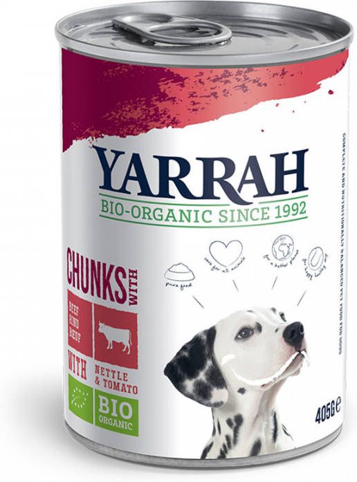 Wil je jouw hond een lekkere vleesmaaltijd voorschotelen met biologische kip en rund gecombineerd met biologisch gecertificeerde brandnetel en tomaat? Kies dan voor Biologisch Hondenvoer Chunks met Rund van Yarrah. Een complete, voedzame en zeer smakelijke voeding voor alle honden, van puppy tot senior.